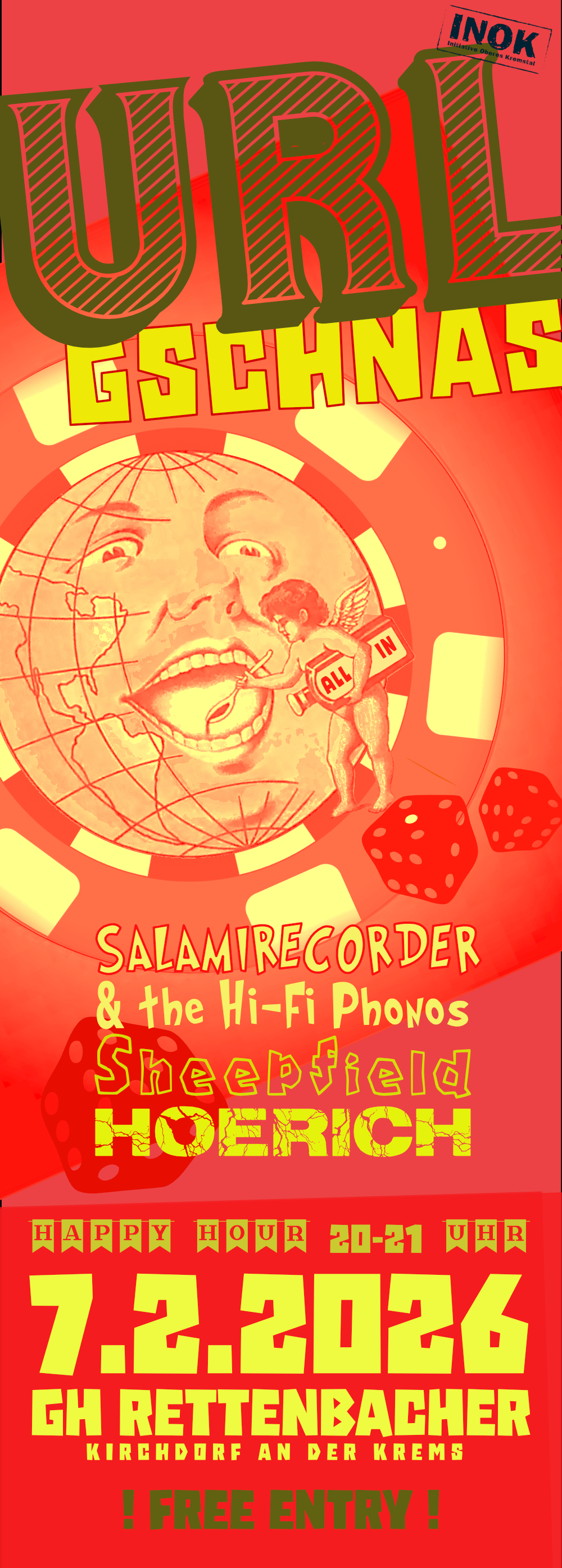 Neu sind auch die Trash-Tombola, ein dampfender Wursttopf mit Kesselheißen vom Schölli und das Getränke-Würfeln, das nach vielen Jahren ein Revival erleben wird. Treu bleibt sich das Url-Gschnas hingegen als Laufsteg für ausgefallene Verkleidungen und als Bühne für hervorragende Musik: Für letztere sorgen diesmal Sheepfield (Punkband aus Wels), die Headliner von Salamirecorder & The Hi-Fi Phonos (Garage Punk/Surf aus Wien) und Lokalmatador Hoerich.