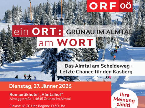 Am Dienstag, 27. Jänner 2026, von 19.30 bis 20.30 Uhr überträgt ORF Oberösterreich live in ORF ON eine neue Ausgabe von „Ein Ort am Wort – Red’ ma drüber“ aus dem Romantikhotel Almtalhof in Grünau im Almtal. Thema der neunten Folge ist „Das Almtal am Scheideweg – Letzte Chance für den Kasberg“. Bürgerinnen und Bürger sowie Expertinnen und Experten diskutieren gemeinsam über die Zukunft des regional bedeutenden Familienschigebiets. ORF Radio Oberösterreich sendet am Folgetag die ungekürzte Aufzeichnung.