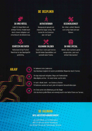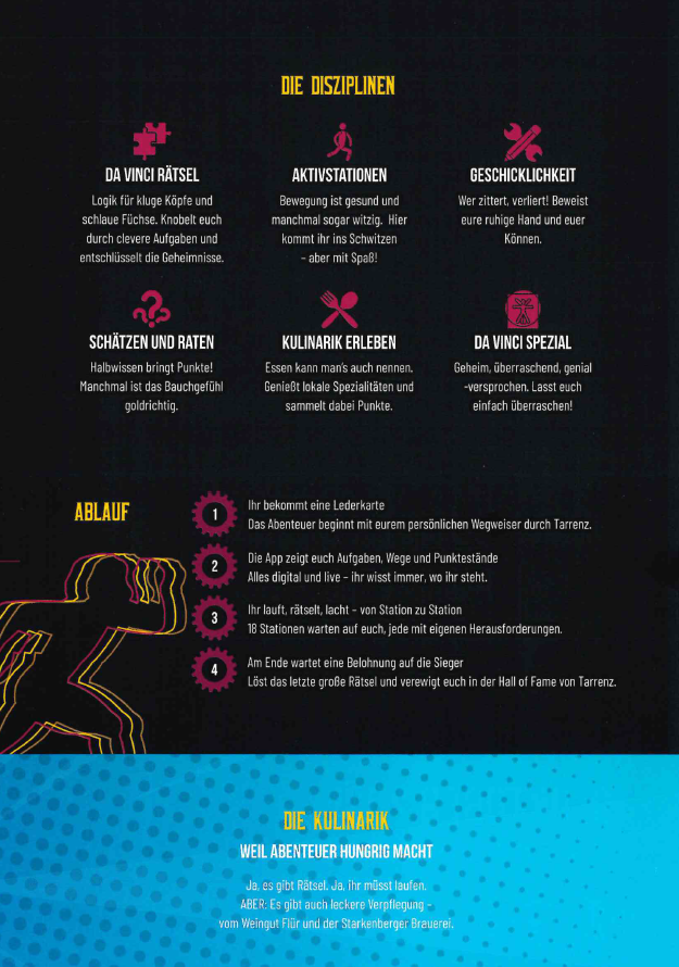 Eine epische Dorf-Rallye. Ein Abenteuer für Teams. Und ein bisschen wie ein Escape Room – nur draußen. Schnappt euch eure besten Freunde, Kollegen oder Schwiegereltern, nur wenn sie fit genug sind, und zieht los. Mit einer geheimnisvollen Lederkarte und einer cleveren App erkundet ihr Tarrenz. An 18 Stationen heißt’s: Rätseln, Schätzen, Schwitzen und Lachen – Punkte gibt’s live in der App!