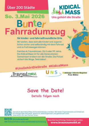 Unter dem Motto "Kinder fahren Rad – Gemeinsam sicher durch die Stadt" radeln Klein und Groß wieder gemeinsam durch Braunau. Wie an vielen anderen Orten in ganz Europa wollen auch wir damit für sicheres Radfahren für Kinder im Straßenverkehr eintreten. Denn: Die meisten Kinder fahren gerne Rad. Damit sie dabei aber auch sicher unterwegs sind, braucht es entsprechende Infrastruktur. Die Kidical Mass will auf dieses Bedürfnis hinweisen und gleichzeitig bei einer gemeinsamen, geschützten Ausfahrt Kindern die Freude am Radfahren erhalten. Dazu borgen wir uns von den Autos die großen Straßen aus und radeln über Braunaus Straßen bis zum Kreisverkehr an der Innbrücke, wo es dann auf der Simbacher Seite weitergeht.