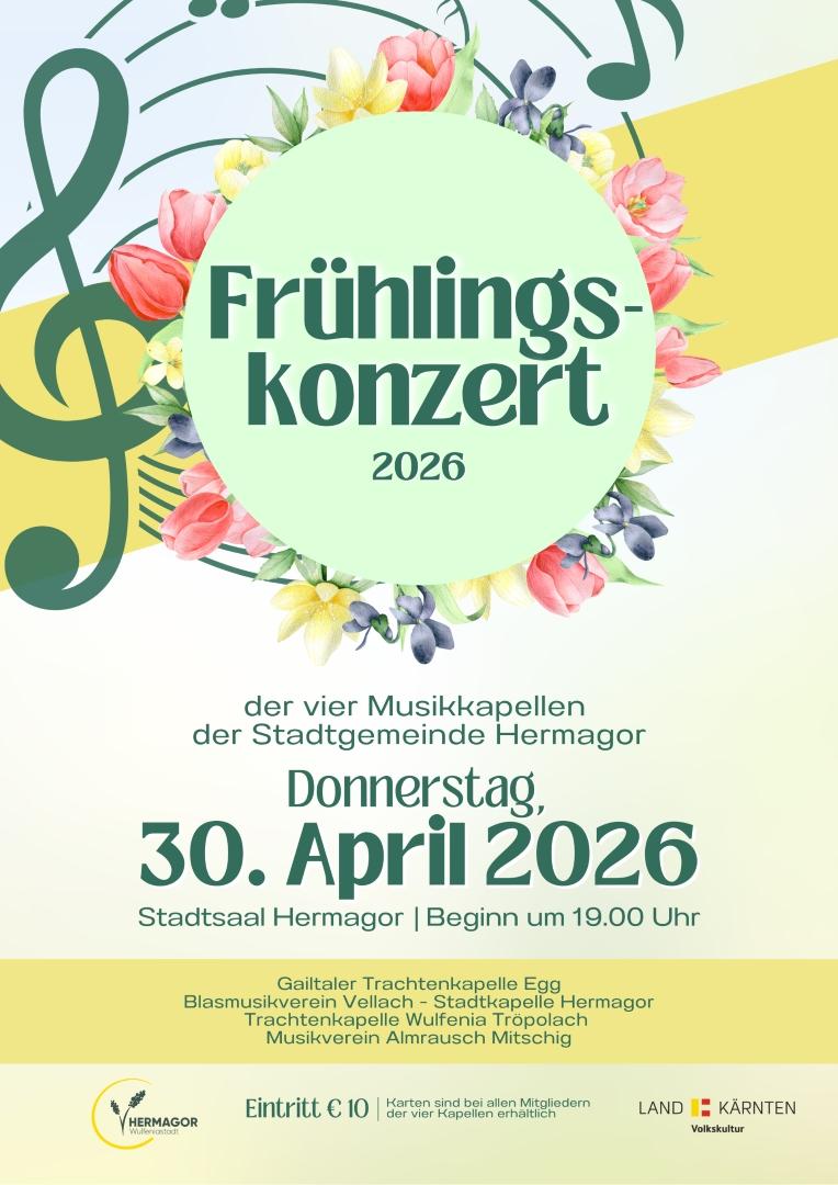 Die vier Musikkapellen der Stadtgemeinde Hermagor laden am Donnerstag, 30. April 2026, um 19:00 Uhr herzlich in den Stadtsaal Hermagor ein.