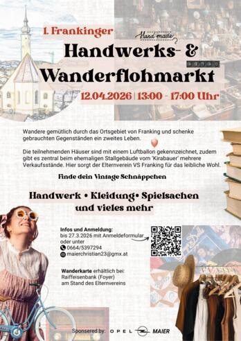 Wandere gemütlich durch das Ortsgebiet von Franking und schenke gebrauchten Gegenständen ein zweites Leben. Die teilnehmenden Häuser sind mit einem Luftballon gekennzeichnet, zudem gibt es zentral beim ehemaligen Stallgebäude vom ‘Kirabauer’ mehrere Verkaufsstände. Hier sorgt der Elternverein VS Franking für das leibliche Wohl.