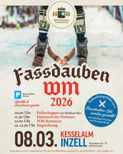 Auf geht`s zur 8. Fassdauben-WM - das Hofbräuhaus Traunstein lädt wieder in seine Chiemgauer Heimat ein – diesmal bei der Kesselalm in Inzell. Am Sonntag, 8. März um 12 Uhr heißt es: O`zapft is und Start!