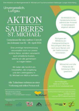 welche wir alle gemeinsam zu tragen haben. Wir laden alle herzlich ein, mitzuhelfen, die Umgebung und den Lieblingsplatz in St. Michael von Müll zu befreien.
