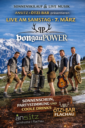 Am Samstag, 7. März ab 12:00 Uhr sorgt die Band PongauPOWER bei der Ansitz Schihütte & Ötzi-Bar in Flachau für beste Stimmung. Freut euch auf Live-Musik, Partystimmung und coole Drinks beim Sonnenskilauf. Die perfekte Gelegenheit für eine musikalische Pause im Skigebiet.