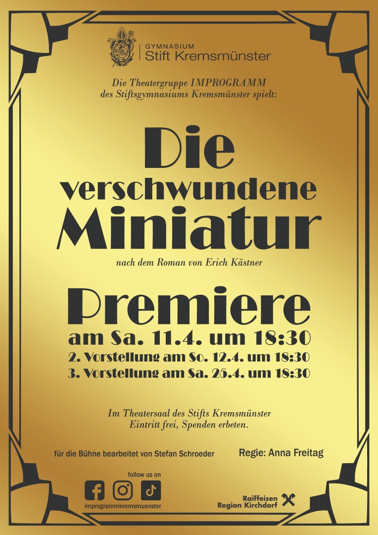 Es erwartet Sie eine rasante Kriminalkomödie bearbeitet von Stefan Schroeder, mit vielen überraschenden Wendungen, gespielt von vielen talentierte Schülerinnen und Schülern der Oberstufe im Theatersaal des Stifts Kremsmünster.