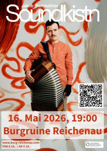 Jakob Steinkellner (Steirische Harmonika, Gesang) und seine Soundkistn bieten mehr als nur ein Konzert – es erwartet Sie eine Reise in eine Welt, die sich jeder Schublade entzieht. Gemeinsam mit Tomáš Novák (Violine, Mandoline, Gesang) entfaltet sich ein Klangkosmos, der in jeder Note das Unbekannte, das Ungeahnte sucht und folglich berührt. Ihre Musik, geboren aus der Steirischen Harmonika, verfeinert mit virtuosen Geigenklängen und inspiriert von den Weiten der Welt, ist so vielfältig wie die Geschichten, die sie erzählt.