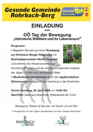 Begeben Sie sich auf einen Rundgang am Rohrbach-Berger Rätselweg mit Bezirksjägermeister Martin Eisschiel und erfahren Sie Wissenswertes über heimische Wildtiere und die verantwortungsvolle Aufgabe der Jäger für Wild und Lebensraum Wald.