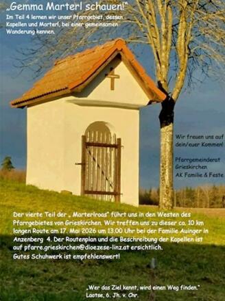 Der vierte Teil der "Marterlroas" führt uns in den Westen des Pfarrgebietes von Grieskirchen. Wir treffen uns zu dieser ca. 10 km langen Route am 17. Mai 2026 um 13.00 Uhr bei der Familie Auinger in Anzenberg 4. Der Routenplan und die Beschreibung der Kapellen ist auf www.pfarre.grieskirchen@dioezese-linz.at ersichtlich.