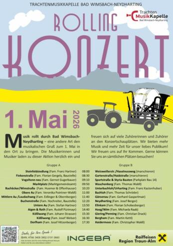 Musik rollt durch Bad Wimsbach-Neaydharting - eine andere Art den musikalischen Gruß zum 1. Mai in den Ort zu bringen. Die Musiker:innen laden zu dieser Aktion herzlich ein und freuen sich auf viele Zuhörer:innen an den Konzertschauplätzne. Wir bieten mehr Musik und mehr Zeit für unser liebes Publikum!
