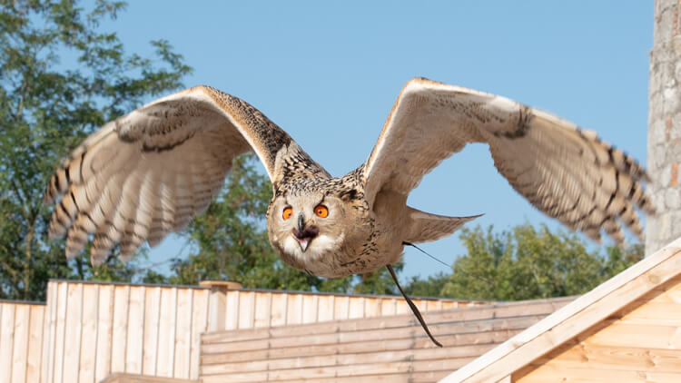 Spektakuläre Sturzflüge von verschiedenen Adlerarten und Falken, die mit enormer Geschwindigkeit und erstaunlicher Geschicklichkeit vehement von in der Luft gedrehte Beute-Attrappen jagen, gehören genauso zu den Vorführungen, wie die wegen ihrer Körpermaßen (ca. 15 kg) und Flügelspannweiten (bis zu knapp 3 Meter) bewundernswerten Geier, die hautnah über das Publikum streichen.