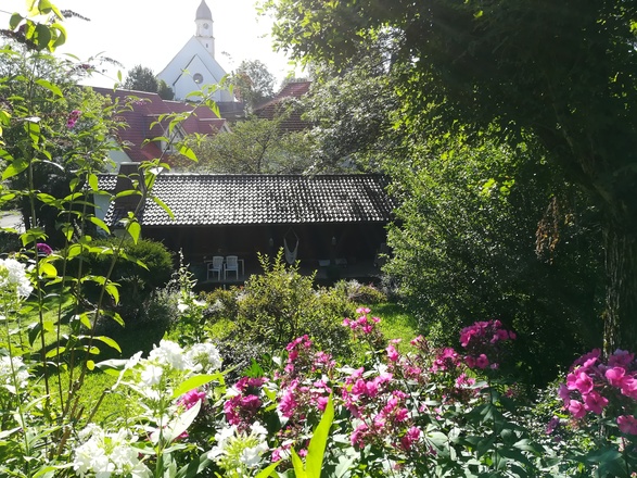 Unser Naturgarten mit großer Liegewiese und Freisitz mit Feuerstelle sind für unsere Gäste frei nutzbar.