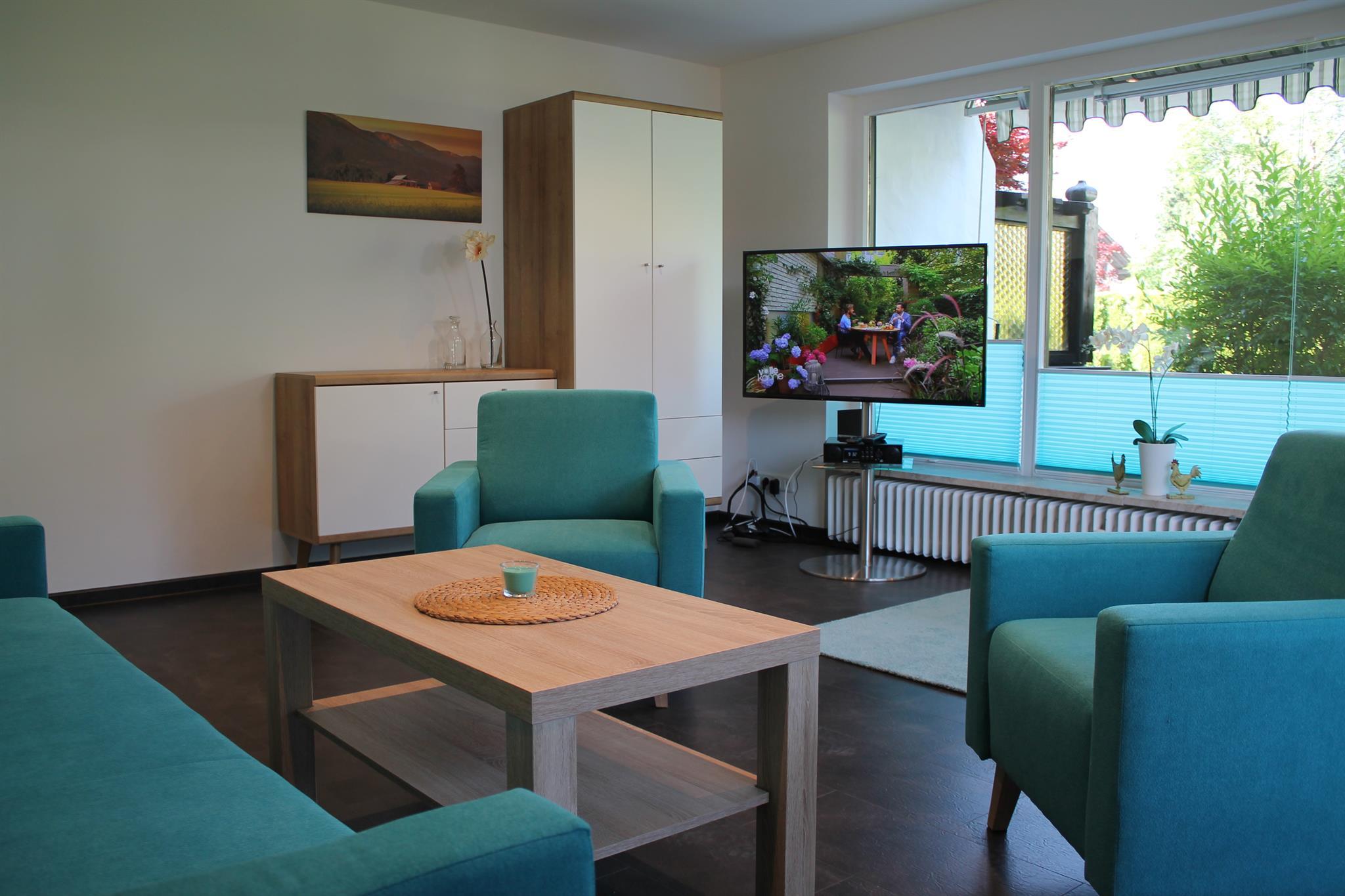 Die großzügige, lichtdurchflutete Wohnung ist zum größten Teil neu renoviert und befindet sich im Erdgeschoß eines gepflegten Hauses mit nur 6 Wohneinheiten. Sie verfügt über eine Terrasse mit tollem Bergblick und einem großen Gartenteil, der zum Entspannen einlädt. Sie besteht aus einem hellen modern eingerichteten Wohnzimmer mit einer Sitzgruppe und einem Schlafsofa, einem Schlafzimmer mit Doppelbett und TV, einer neuen Einbauküche mit Esstisch, sowie einem Badezimmer mit Dusche und einem extra WC. Alle Fenster sind mit Plissees versehen, im Schlafzimmer ist dieses lichtundurchlässig. Im Wohnzimmer finden Sie zudem elektronische Rollos vor.