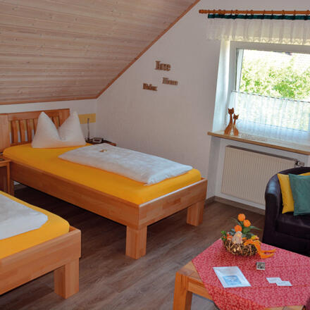 Erholen und entspannen Sie sich in unseren komfortabel und liebevoll eingerichteten Ferienwohnungen. Wohnung I besteht aus einer gut aus- gestatteten Wohnküche, einem Wohnschlafzimmer, Schlafzimmer, Du/WC, SAT-TV, Radio. Wohnung II verfügt über ein Wohn- schlafzimmer, Wohnküche, Du/WC, SAT-TV, Radio. %%Gerne bieten wir für die Wohnungen auch ÜFr an. Doppelzimmer mit Dusche/ WC, SAT-TV und Balkon. Auch als Einzelzimmer buchbar. Besonders geeignet für Radfahrer, ca. 2 km zum RMD-Kanal. Zum Playmobilland ca. 25 Minuten. Garage auf Wunsch. Hund erlaubt.