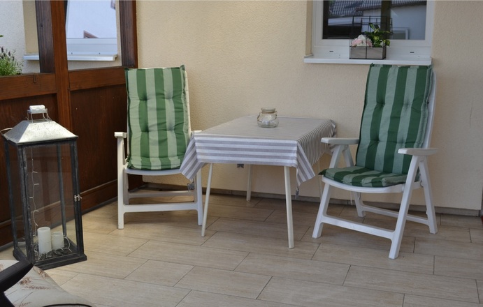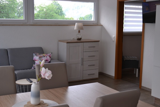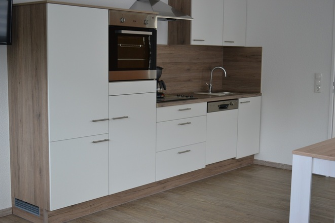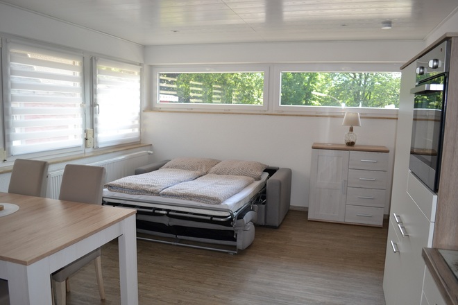 1 Doppelzimmer und 1 Schlafcouch in großzügiger, heller Ferienwohnung - Wohn- und Essbereich mit komplett ausgestatteter Küche und Spülmaschine, Sat-TV, Dusche/WC. 2 Doppelzimmer im Dachgeschoss, beide mit TV.