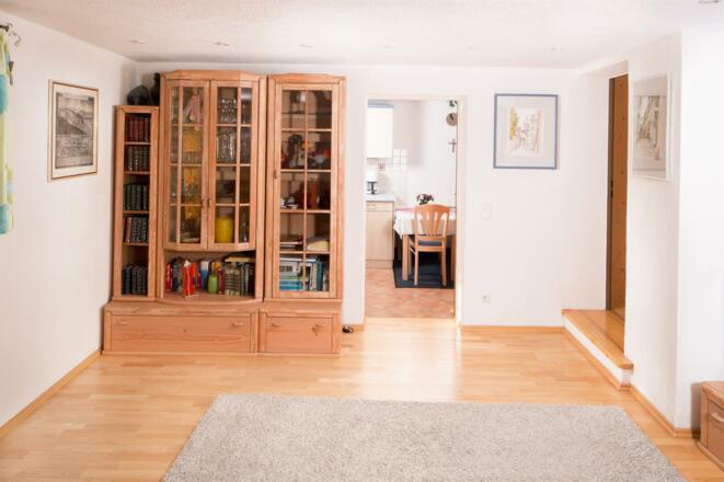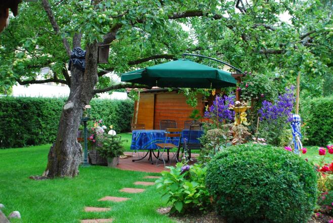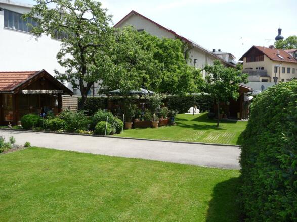 Ruhig gelegen aber trotzdem zentral. Sie erreichen in drei Gehminuten die Marktstraße. Das Erdgeschoss bietet einen eingenen Eingang. Die Liegewiese und Sitzecke unter Apfelbäumen lädt zum Verweilen ein. Das Grundstück bietet einen schönen Garten mit Hecke und einem Spielplatz.