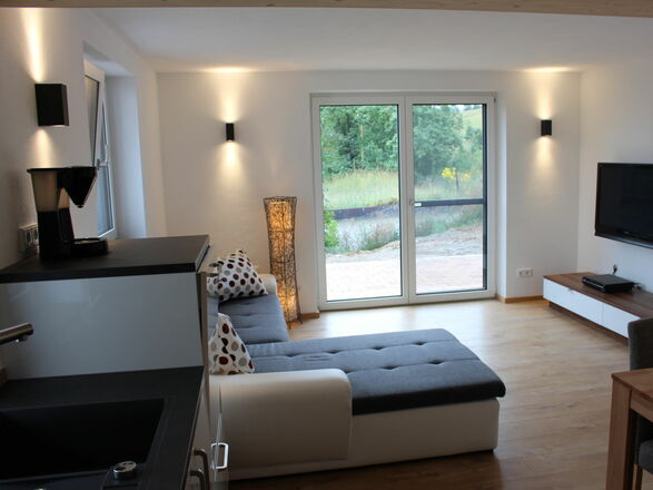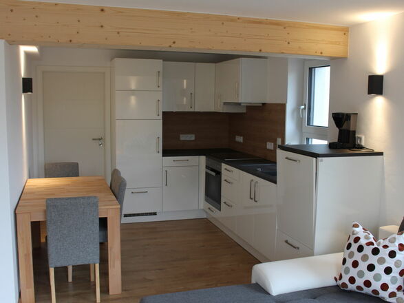 Die Ferienwohnungen bestechen durch die Kombination von gemütlichen Allgäuer Flair in Form von Echtholz-Parkettböden sowie schönen Holzdecken und moderner Einrichtung. Im Zuge der Modernisierung richtetn wir unsere Ferienwohnungen komplett neu ein. Dabei haben wir auch eine neue Markenküchen mit hochwertigen Geräten (Geschirrspülemaschine, Induktionsherd, Dunstabzugshaube, erhöhter Backofen und Kühlschrank mit Gefrierfach - alles Markengeräte) eingebaut. Die Küchen passen mit einer Mischung aus Holz und modernen Akzenten perfekt in die Ferienwohnungen.