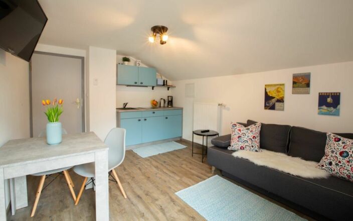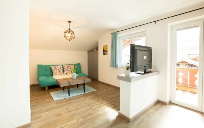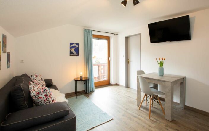 Die Wohnung "Bergglück" 32m² verfügt über: W-Lan, SAT-TV, Smart-TV, voll ausgestattete Küchenzeile, Geschirrspülmaschine, Boxspringbetten 1,6 x 2m, WC mit Dusche. Kombinierter Wohn- Schlafbereich (kein seperates Schlafzimmer), Balkon mit Bergblick (Wettersteingebirge)