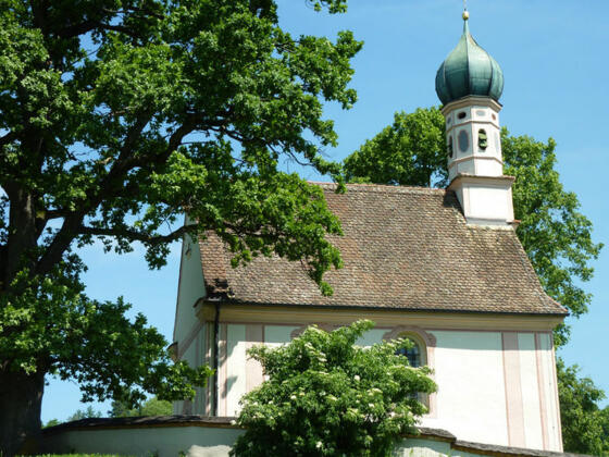 Bevor der Fußweg schon bald auf einen breiteren Weg mündet, passieren wir einen im Sommer 2011 angelegten Informations- und Aussichtsstadl. Wir halten uns anschließend rechts und gleich wieder links zur Ramsachkirche „Ähndl“. Wir folgen dem Weg, der später zu einer landwirtschaftlich genutzten Straße wird. Schon von weitem können wir das Kirchlein sehen, seit Jahrhunderten Wahrzeichen dieses Ortes.