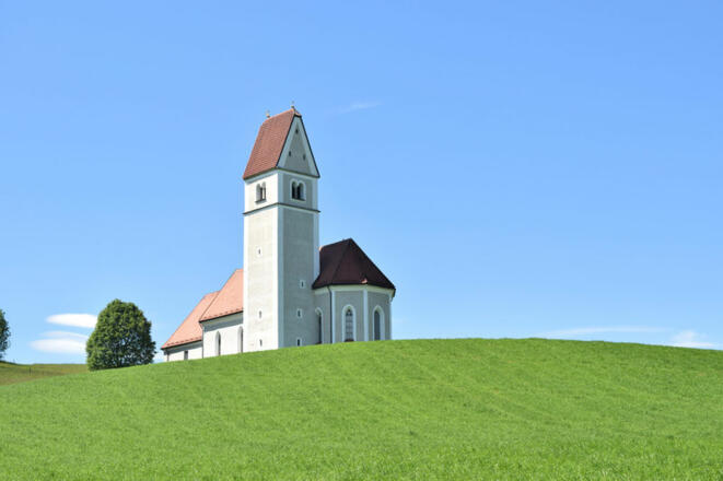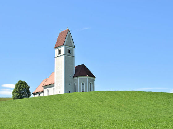 Unter der Autobahn durch geht es leicht bergauf nach Stockach und Niesberg. Von hier aus einmaliger Blick über die Gebirgskette vom hohen Staufen im Osten bis zum Wendelstein im Westen. Auf Feldweg weiter nach Greimelberg, einem der ältesten Orte der Gegend und – jetzt wieder auf Asphaltstraße – zur Wallfahrtskirche St. Florian.