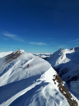 Nun gehts weiter über einen tollen Schneegrat zur Frauenwand (Wechten beachten!).