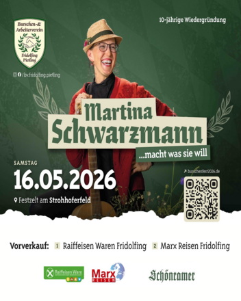 Kabarett mit Martina Schwarzmann; Kartenvorverkauf bei Raiffeisen Waren Fridolfing und Marx Reisen.
