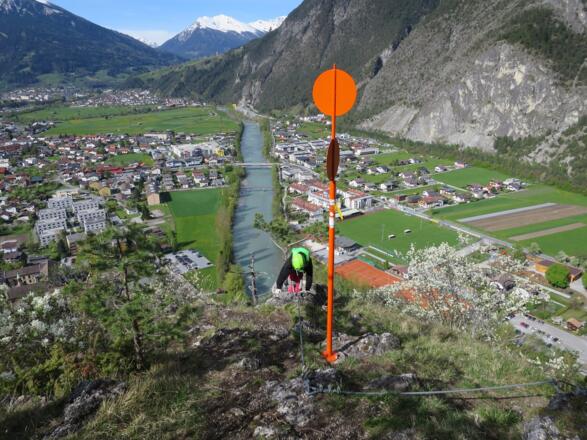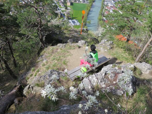Abstieg: Beim Ausstieg erwartet uns eine Bank mit toller Aussicht ins Inntal. Der markierte Abstiegs-Steig führt noch ein paar Hm hinauf. Dann folgt man den Wegweisern nach O einem steilen Steig hinab zum Inn. Auf der Asphaltstraße gelangen wir zurück zum Krankenhaus-Parkplatz.