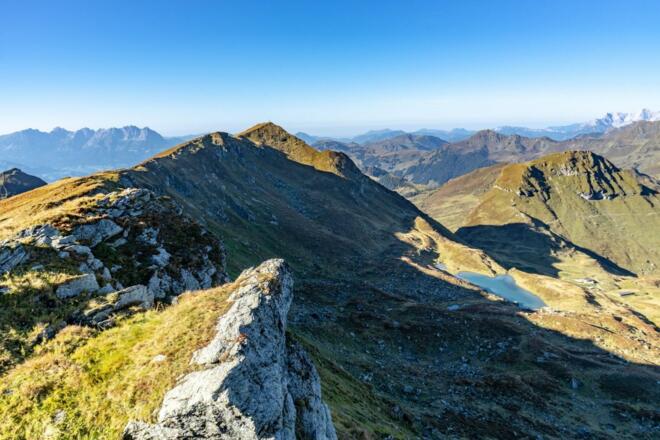 Vom Parkplatz Bochumerhütte (Kelchalm Ruine) führt die Strecke des 9-Gipfel Erlebnisses über die Bochumer Hütte zum 1. Gipfel, dem Laubkogel. Von dort geht es den Kamm entlang zum Hahnenkampel, Rauber und Saalkogel. Ein Aufstieg zum 5. Gipfel, dem Tristkogel, garantiert einen einzigartigen Ausblick auf die umliegende Bergwelt. Nach einer kleinen Stärkung geht es ein Stück bergauf in Richtung Torsee zum Teufelssprung. Über den 7. Gipfel, dem Gamshag, erreicht man den Kleinen Schütz, sowie den Schützkogel (Großer Schütz). Der Abstieg folgt über die Schlichtenalm und der Niederkaseralm wieder zurück zum Ausgangspunkt der Tour.