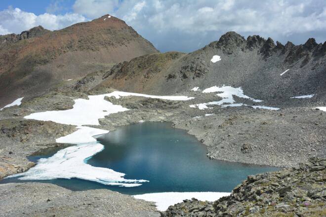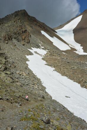 Vom Schafbicheljoch führt ein gut markierter Weg bis zum Matnaljoch. Ein gut 60m langer Abstieg über ein Schneefeld führt hinunter zum Ludwig Dürr Weg. Ein kleiner See ladet nochmals zu einer kleinen Pause ein, bevor es wieder gemächlich hinunter zur Friedrichshafener Hütte geht.