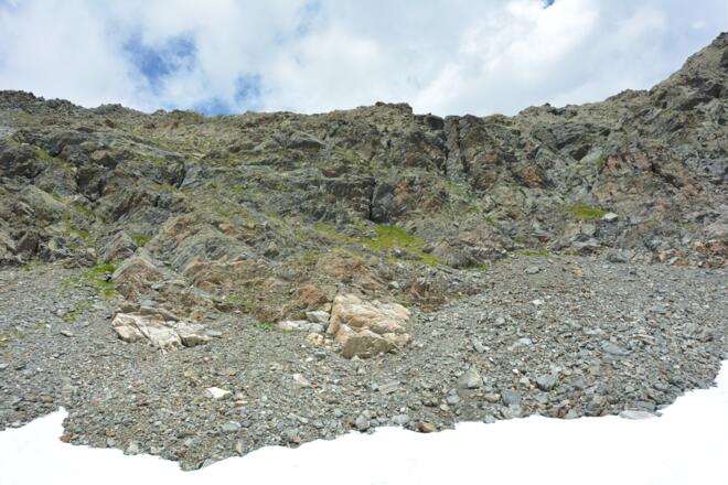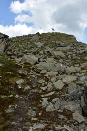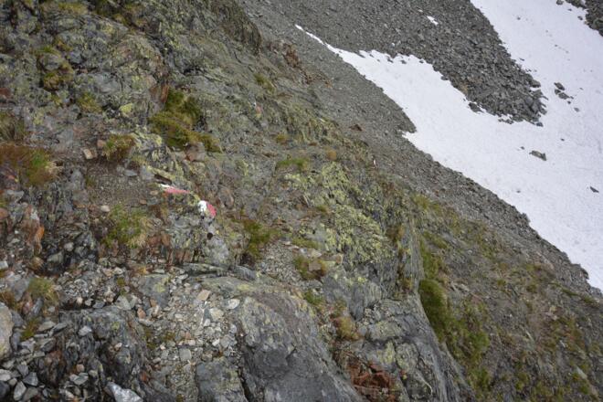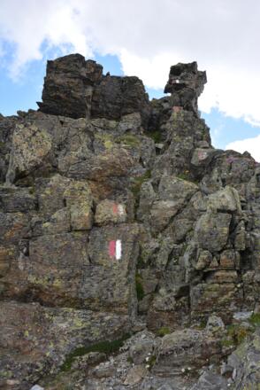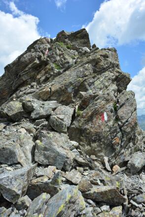 Vom Gipfel geht es wieder runter zum Hauptweg und wir folgen der Markierung Richtung Vertineskopf. Beim Aufstieg ist auf möglichen Steinschlag durch vorausgehende zu achten.
