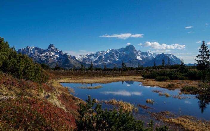 Nach circa 2,5 Stunden Wanderung überrascht ein 360 Grad Panoramablick. Nehmen Sie sich Zeit, ausgiebig das Tennengebirge, Dachsteinmassiv, den Gosaukamm, die Niederen Tauern und die Bischofsmütze zu betrachten. Kurz vor dem Gipfel überqueren Sie ein großes Latschenkiefernfeld. Der Duft ist berauschend! Zuhause verwenden Sie vielleicht schon das ätherische Öl, das positiv auf Atemwege und Lunge wirkt. Zum Rasten und Jausnen lädt die Schäferhütte, circa 10 Minuten vom Gipfelkreuz entfernt, ein. Faszinieren Sie Kraftplätze, dann besuchen Sie Filzmoos. Dieses bezaubernde Örtchen verfügt seit kurzem über 16 offizielle Plätze dieser Art. Die „Schwarze Lacke“ – die Sie passieren, wenn Sie den Gerzkopf besteigen, gehört auch dazu. Sie ist ein Naturbiotop und spiegelt die Bergwelt auf wundersame Weise wieder. Jeder Kraftplatz erfüllt eine andere Aufgabe und zieht daher die unterschiedlichsten Menschen an.