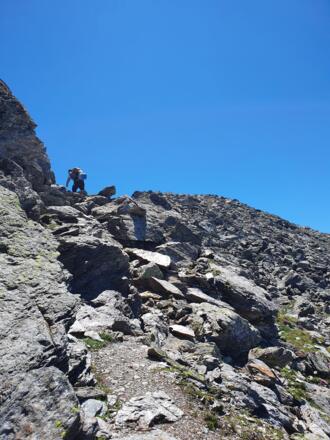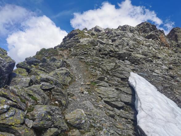 Über Gamslahnerspitze 2.681m, Kreuzjöchl 2.575m, Kreuzspitze 2.746m, Rosenjoch 2.796m, die Grünbergspitze 2.790, zur Grafmartspitze 2.720m. Diese erste Hälfte ist teilweise kein Steig, sondern Blockwerk - aber alles gut markiert!