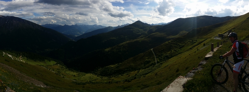 Auf ca 1680m kommt eine Abzweigung. Hier könnte man links die Tour Richtung Sandjöchl erweitern. Wir fahren rechts weiter, immer aussichtsreich, hoch über dem Brenner weiter.