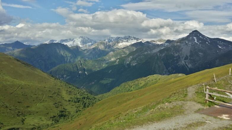 Wieder zurück bei dem Platz mit den Betongebäuden, nun links hinunter auf steilem, alten Karrenweg zur italienischen Sattelalm und weiter rechts Richtung Steinalm, aber noch vor den Almwiesen steil in vielen Kehren hinunter zum Brenner und über den Radweg zurück zum nahen Parkplatz.