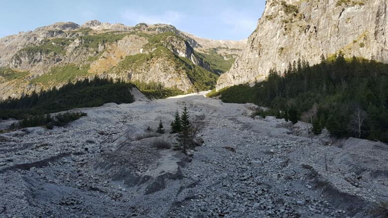Vor der Gufelbrücke gehen wir rechts aufwärts, um weiter rechts des Jochbachs sehr abwechslungsreich zu den Jochbachhütten zu kommen. Einige Minuten später verlassen wir den Weg an einem großen Felsbrocken mit rotem Punkt. Hier geht es rechts über Gras hinauf, man durchquert ein Wäldchen, gelangt auf einer Lichtung zu drei Birken, geht am besten nach links zum Waldrand, zwischen den Bäumen, oft auch im Geröll, hoch, hoch, hoch, immer weiter hoch, bis zu einer Tanne mit einem verblassten roten Punkt. Dann noch ca. 30m höher, quer über ein unangenehmes Geröllfeld, danach eine ca. 50m lange Querung, findet man mit etwas Fantasie Pfadspuren, die einen über die erste Wandstufe nach oben führen. Pause bei 1510m hinter einer Felswand. Ab hier führen uns rote Punkte (Beruhigungspunkte) zuerst durch ein Latschenfeld, dann durch ein größeres Alpenrosengelände (hier heißt es aufpassen!) bis zu einem kleinen Plateau nach oben. Pause bei 1880m.