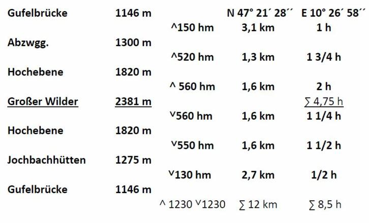 Abwechslungsreicher Weg bis zu den Jochbachhütten, nach der Abzweigung eine etwas schwierige Wegsuche über Geröll und durch Latschen bis zur ersten Wandstufe, dann auf Trittspuren bis zum Goldbrünnle. Oberhalb über eine Karstebene Richtung Einsattelung zwischen Haupt- und Südgipfel.