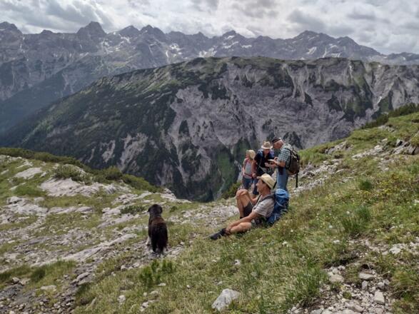 Hier angekommen, sieht man einen großen roten Punkt auf einer Platte, den man wiederum beim Rückweg von oben anpeilen muss, um den Abstieg zu finden. Nach wenigen Metern kommen wir zum Bach Goldbrünnle. Hier ist es sehr reizvoll, links der Bachkaskaden aufzusteigen, um auf ca. 2100m Höhe das felsige Karstgelände zu gewinnen. Nun ist der weithin gut sichtbare Hintere Wilde unser Richtungsweiser zu unserem nächsten Ziel, der Scharte zwischem Hinteren und Großen Wilden. Nach einem fantastischen Blick hinüber zur Höfats, schaffen wir in ein paar Minuten auch noch den Hauptgipfel des Großen Wilden.