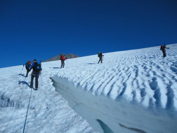 Beim Aufstieg sind die Spalten gut sichtbar und leicht zu umgehen; beim Abstieg gibt es mehr Spalten zu umgehen. Es kann notwendig sein eine eigene Spur anzulegen.