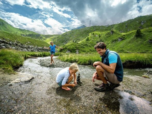 Bei der Häuslalm geht’s leicht ansteigend über ein Hochmoor zu einem kleinen Berggraben.