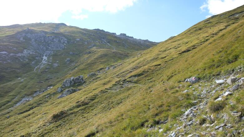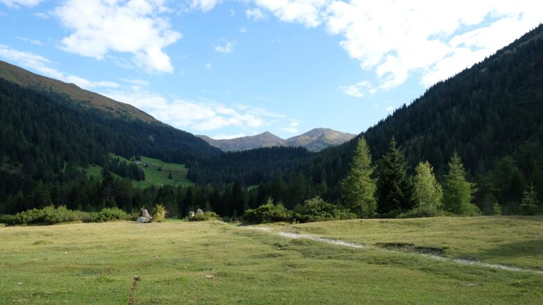 Vom Parkplatz neben dem GH Waldesruh führt anfangs eine asphaltierte Straße in westliche Richtung, vorbei an den letzten Höfen und Behausungen des Tals. Kurz dahinter, am Ende der Straße, kommt es zur Aufteilung der Wege, hier ist der linke Wiesenweg mit der Nr. 127, der sich weiter dem Talboden entlang schlängelt, zu nehmen. Nach einigen huntert Metern, hinter einen Murengraben, liegt dann rechts bergseitig etwas versteckt die schön gestaltete Hubertuskapelle. Eine kurze Besichtigung ist auf jeden Fall lohnenswert, weiter gehts dann durch leicht ansteigendes Gelände einen schönen breiten Steig entlang nach Hinterenns. Schließlich erreicht man einen kleinen Almboden und einen Wegweiser, der die Aufzweigung der Wege zu verkünden versucht. Der rechte Weg mit der gleichbleibenden Nr. 127 ist hier der Richtige, diesen ist folgen. Nun gehts in Serpentinen für gut 500 hm der rechten Bergflanke entlang nach oben, bis man auf dem vom Nösslachjoch kommenden Panoramaweg gelangt. Hier vereinigen sich beide Wege und führen gemeinsam leicht ansteigend in südlicher Richtung hoch bis zum Gstreinjöchl.