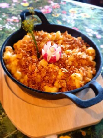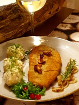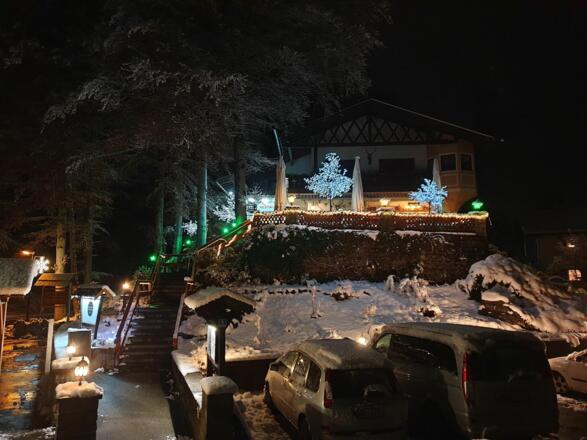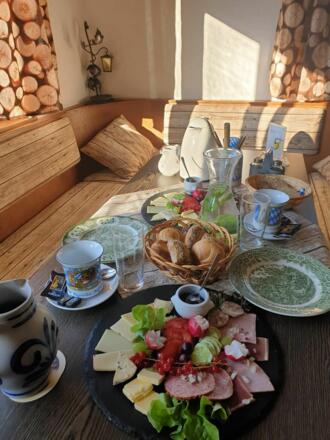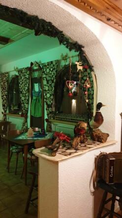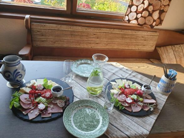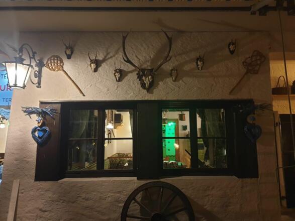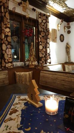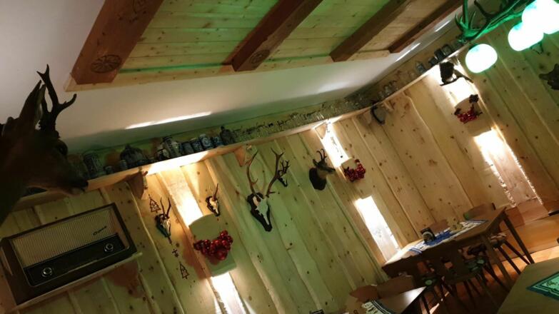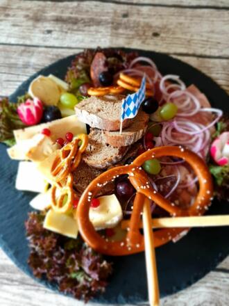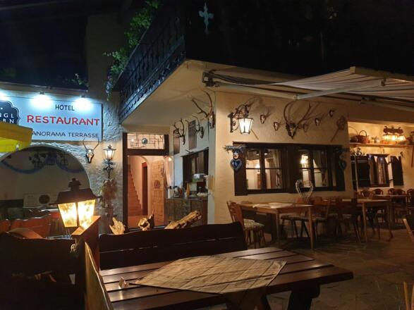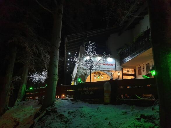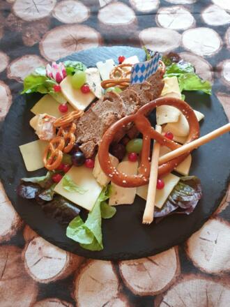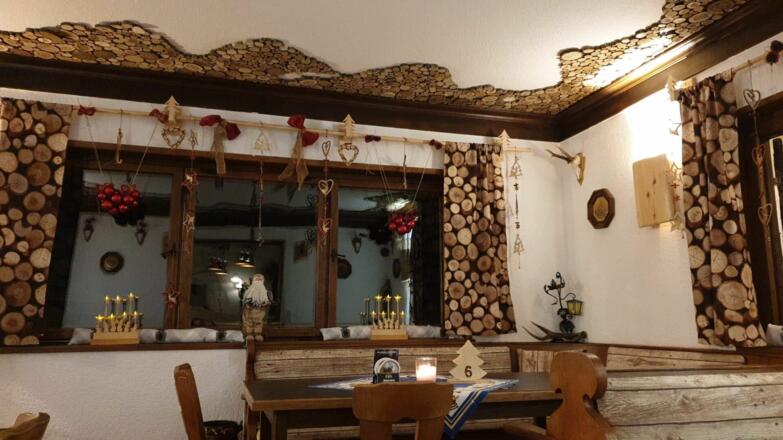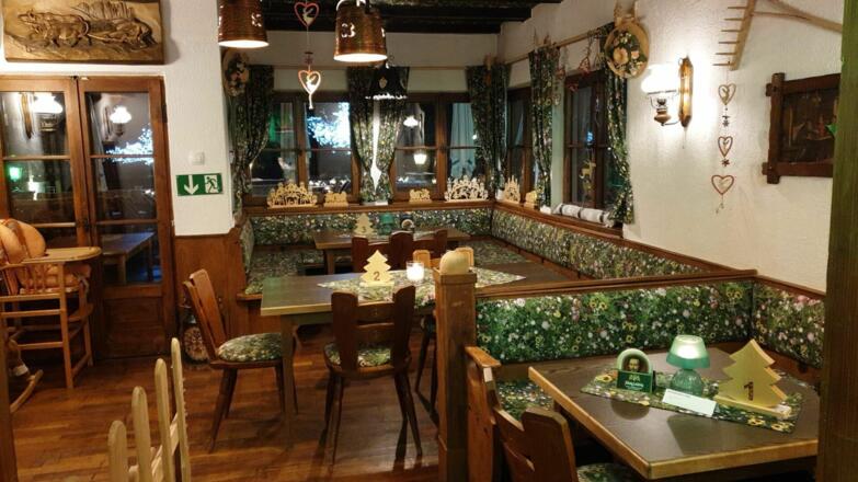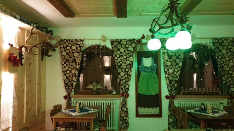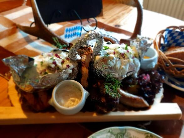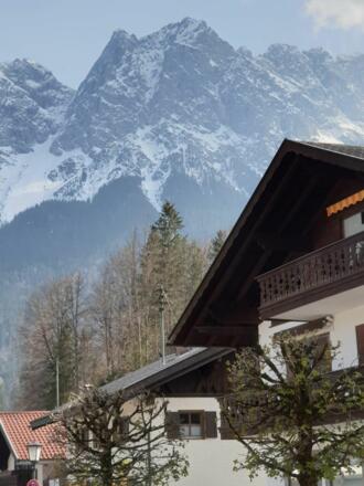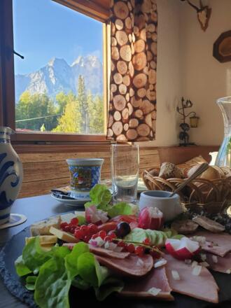 Unten im Haus befindet sich ein bayerisches Speiselokal mit einer Terrasse und dem direkten Blick auf die Zugspitze.