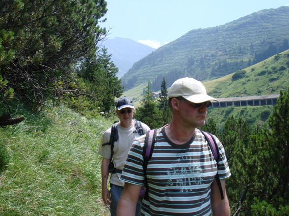 Vom Hotel aus wandert man bis zur ersten Alpe und dort im rechten Winkel vorbei am Brunnen über die Brücke und unter der Straße durch zum Weg Richtung Tschirggen. Auf dem Güterweg bis zu den 3 Städel bergan wandern. Danach geht’s zum Hirschgehrenbach und direkt am Eisengatter steil bergauf bis zum Viehweg zur oberen Hirschgehrenalpe. An der Oberen Hirschgehrenalpe geht amn rechtseitig unter der Seilbahn vorbei bis zum Stacheldrahtzaun, den Zaun übersteigen und im direkten Weg zur etwas unterhalb liegenden Triftalpe gehen. Es gibt dort keinen Weg aber die Hütte ist gut sichtbar und das Gelände ist nur eine Alpweide und gut begehbar. Ab der Hütte kommt am wieder auf einen Weg der teilweise etwas Steil bis zum Abzweig Schrofenpass führt.Von gehts bergauf auf den Schrofenpass. Der Weg zum Schrofenpass ist im oberen Teil in eine Felswand gesprengt und zum Teil recht ausgesetzt. Ab dem Schrofenpass gehts über Almweiden bis nach Gehren (Nicht nach Lechleiten sondern beim alten Zollhaus rechts nach Gehren) und beim Haus Gehrnerhof muss man durch den Hof gehenund kommt hinten auf den Raugehrenweg. Der Rauhgehrenweg ist ein landschaftlich schöner Steig vis a vis der Lawinenverbauung. Ab dem Tunnel muss man noch ein kurzes Stück auf der Bundesstraße bis zur Jägeralpe gehen.