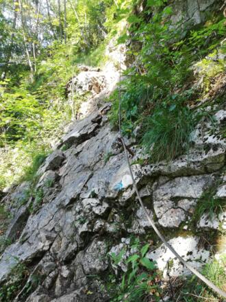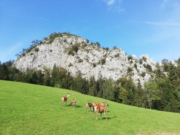 Den gleichen Weg zurück und jetzt auch der Abzweigung auf den kleinen Barmstein folgen. Hier ist der Pfad leichter, da fast durchgehend Stufen mit Handlauf angelegt sind. Nach einer Rast um den wunderschönen Ausblick auf den Dachstein und andere Gipfel der Region folgen wir den Weg wieder zurück bis zur Lichtung.