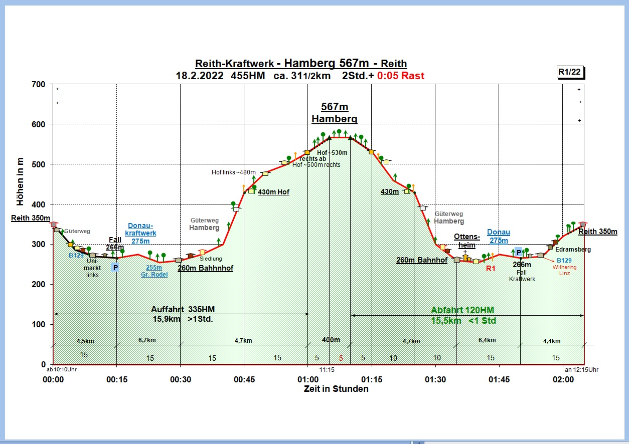 ANFAHRT: Von Reith am Güterweg hinab, knapp vor der B129, rechts ab und bis zum Ende der Gartenstraße. Dann links, bei der B129 rechts auf den Radweg und bis vor den UNI-Markt. Hier links über die B129 und zum Parkplatz Kraftwerk (266 m). Über die Donau (275 m), links kurz am Radweg R1 und rechts Richtung Ottensheim abbiegen. Vorbei an der Regattastrecke, rechts über die Rodlbrücke (255 m) und rechts haltend zur Donau und zur Fähre. Wir folgen gerade dem Radweg und erreichen die B127 von Linz kommend. Kurz links (~400 m) folgen und bei der großen Kreuzung mit Ampel rechts über die Geleise (Bahnhof). Kurz gerade weiter, dann gabelt sich der Radweg und wir halten uns links (Güterweg Hamberg). Es geht bergan durch eine Siedlung und nach grob 800 m biegt rechts der Güterweg ab. Leicht bergab zu einer Senke (Höhe ~300 m) mit Grünschnittsammlung rechts. Es geht steiler bergan am Güterweg Hamberg, vorbei an einigen Häusern und durch den Wald zu einer Abzweigung um 430 m, (rechts ist ein Hof). Gerade weiter, wir passieren einen Hof links, dann rechts einen auf 495 m. Noch vor der Linkskurve zweigen wir rechts ab zum Hamberg. Vorbei an einem Hof (~530 m) hat man um 540 m einen grandiosen Blick zum Kraftwerk und zum Stift Wilhering. Etwas zurück, Rad deponieren und am Waldrand rauf zum Hamberg (567 m) ist jedoch bewaldet, doch nach NO schöner Blick. 335 HM, gut 1 Std. (mit E-Bike für nicht so Geübte, gute Radfahrer brauchen kaum länger) und ca. 15,9 km.