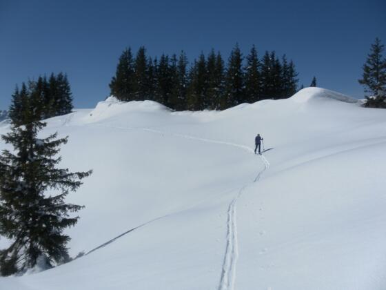 Entlang der Pisten oder etwas abseits davon steigt man auf mildem Almgelände über die sonnigen Hänge zu den beiden Gipfelzielen an. Das großzügige Pistenangebot inklusive Variantenhänge verspricht feines Abfahrtsvergnügen.