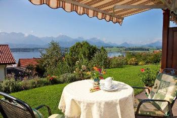 Ruhige Lage, mit herrlichem Blick auf den See und Berge. Ferienwohnung mit Terrasse, Wohn-/Schlafraum getrennt, Sat-TV, Nichtraucherhaus, Parkplatz am Haus. Die Betten sind bezogen, Handtücher liegen auf und werden wöchentlich gewechselt. Waschmaschine- u. Trocknermitbenutzung möglich.