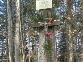 Gegenüber der Kapelle am Distelbergweg nordwärts. Entweder über den breiten Ostrücken am Feldweg zum bewaldeten "Gipfel " des Eugendorfer Bergs oder am Weg weiter bis zum letzten Gehöft und über blass markierte Waldwege hinauf zum Eugendorfer Berg. Am Rücken westwärts zum Gasthaus Am Hochfuchs und an der Schleppliftstation vorbei auf einem Güterweg in den Wald bis zu einer Querstraße. Kurz links und dann rechts am Waldweg hinauf zum Höhenrücken des Petersbergs. Sein bewaldeter Gipfel ist ziemlich verwachsen und kann rechts weglos erreicht werden, bevor der Weg in die Senke vor dem Heuberg hinabführt. Wir zweigen aus der Senke links in den wurzeligen Wanderweg ab, der uns zum versteckten Gipfelkreuz des bewaldeten Heubergs hinaufbringt.
