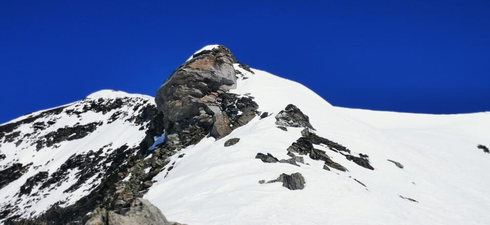 Über den "Sommerweg" südlich vorbei an der der Rojacherhütte, bis zu einer Rinne auf 2860m. Hier steht der technisch schwierigste Teil an "Schlüsselstelle". Im Sommer eine Kletterei im 1-2 Grad, im Winter steil und es herrscht Absturzgefahr (je nach Bedingungen Steigeisen und Pickel von nöten).