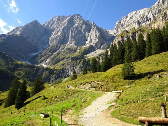 Die zweite Etappe startet bei der Mitterfeldalm. Von hier aus folgen Sie kontinuierlich dem Wanderweg Nr. 401A/430. Dieser führt durch eine bezaubernde Almlandschaft ins malerische Riedingtal mit seinem markanten Gebirgs-Wasserfall und den imposanten Mandlwänden im Hintergrund. Der Weg führt vorbei an den gut erkennbaren natürlichen Sprungschanzen des ehemaligen Skisprungzentrums Riedingtal von Sepp „Bubi“ Bradl. Nach diesem eindrucksvollen Blick auf den Hochkönig setzen Sie Ihre Wanderung durch die Latschenkiefern fort, überqueren die Almböden der "Vier Hütten" und erreichen schließlich das Birgkar. Dort erwartet Sie Ihre nächste Übernachtungsmöglichkeit, die Erichhütte, von der aus Sie die imposante Hochkönig Südwand im Sonnenuntergang bewundern können.