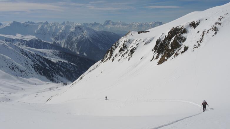 Abfahrt: Vom Gipfel über den Aufstiegsweg zurück in zu einem flachen Sattel, von dort nach Westen abfahren, zuerst in einer flachen Rinne, später über weite mittelsteile Hänge.